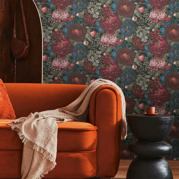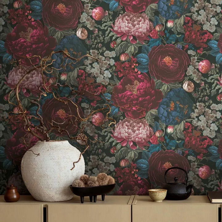 Large, Lush Floral Statement — Oversized red rose motifs make a bold declaration, lending walls a romantic, vintage feel that immediately draws the eye.