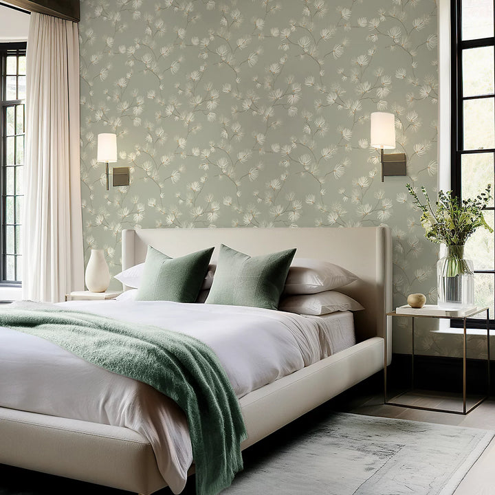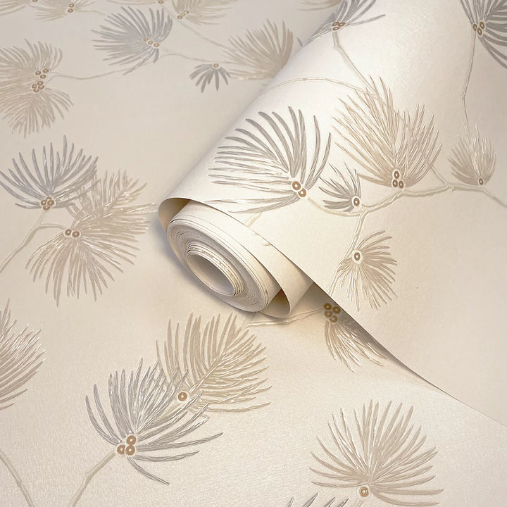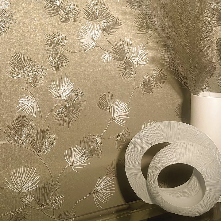 Bring serene elegance into your interiors with the Valentino Pine wallpaper collection. Its graceful pine-leaf trails, each leaf finished with a subtle sequin centre, glide across a rich satin-textured background offering a refined shimmer. Available in soft sage green, creamy neutral, or warm champagne tones, these wallpapers add natural beauty and understated glamour without overwhelming the room.