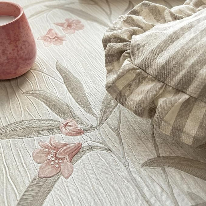Textured / Embossed Backdrop — The raised fabric- / silk-like background gives tactile dimension and catches light subtly, enhancing depth and shadow in the floral patterns.