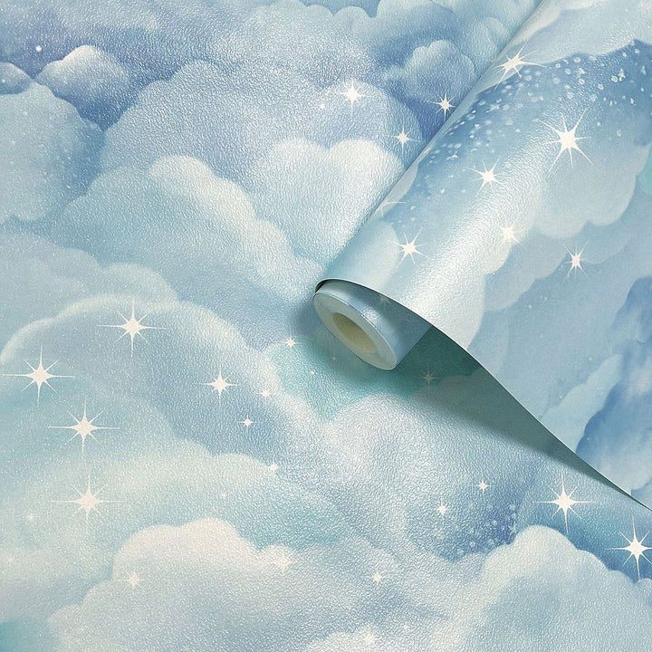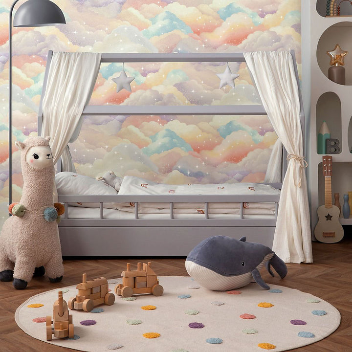 Surround your little one with the soft magic of clouds at sunset with the Dreamland Sparkle Clouds Wallpaper. Designed for nurseries, playrooms, or children’s bedrooms, the wallpaper captures fluffy, drifting clouds floating across tranquil skies, rendered in soothing hues (like dreamy aqua-blue or a multicolour palette of soft pinks, purples and oranges). A gentle all-over glitter effect adds just the right touch of whimsy—twinkling in light without overwhelming. With a lightly textured paper finish, it brings together calm and sparkle in harmony.