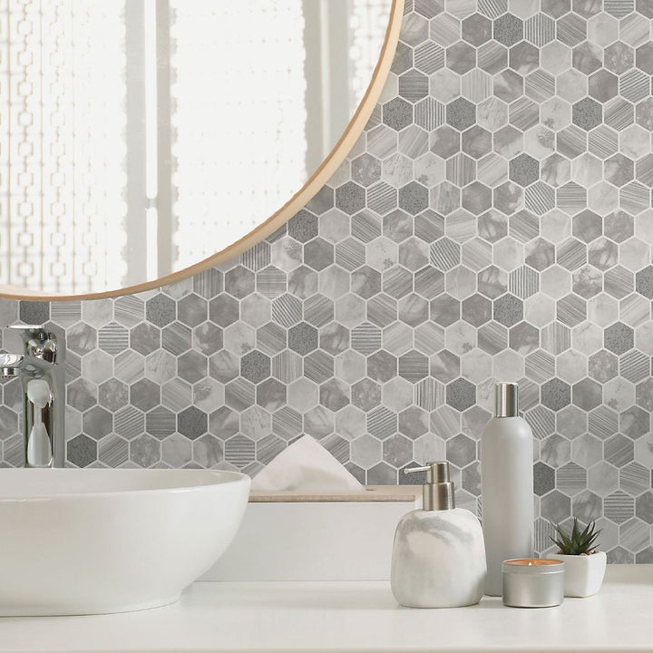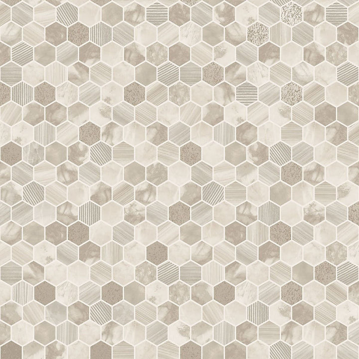 Elevate your walls with the elegant, geometric structure of Hexara Tile Blown Vinyl Wallpaper by Holden Decor. This design features a hexagonal mosaic tile pattern overlaid with soft marble textures and faint linear details, creating a sophisticated, tile-effect aesthetic that reads as modern and refined.