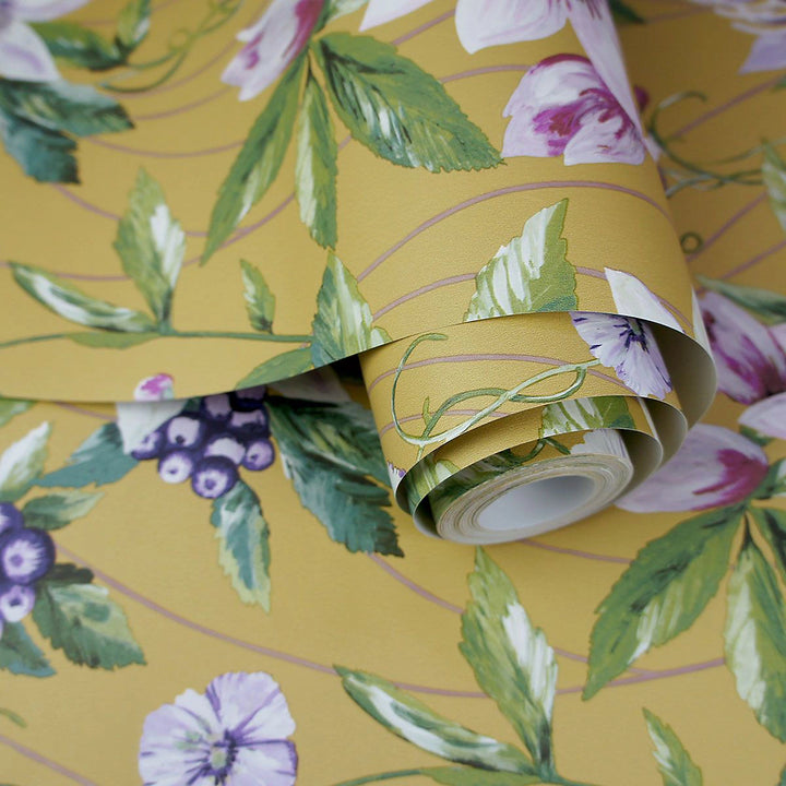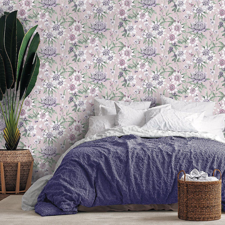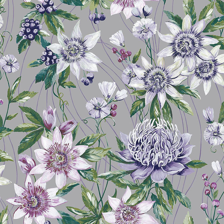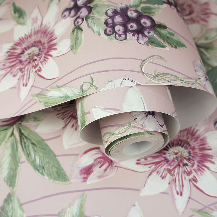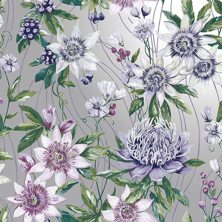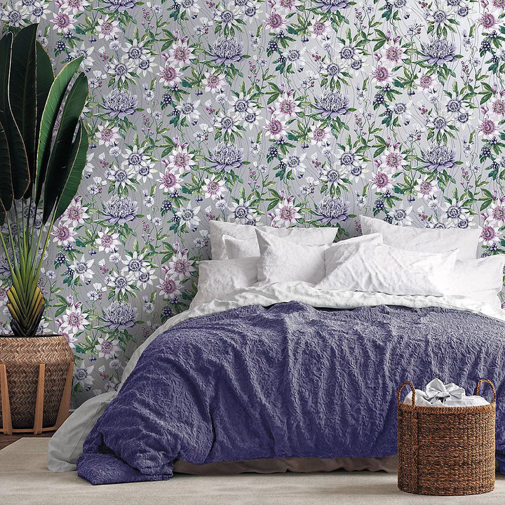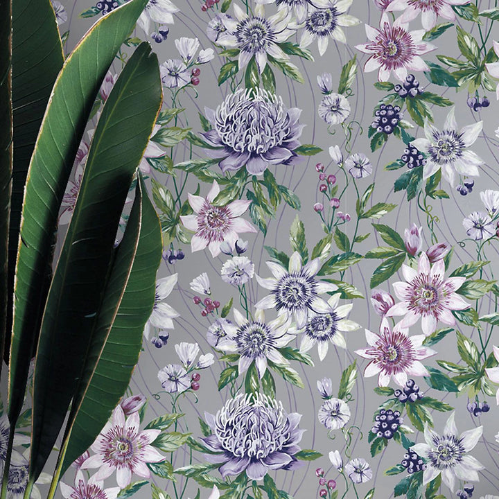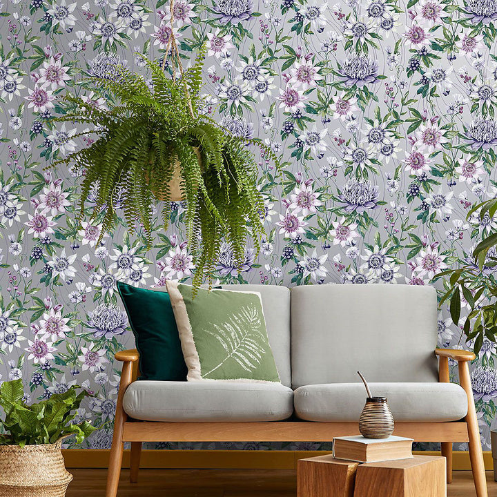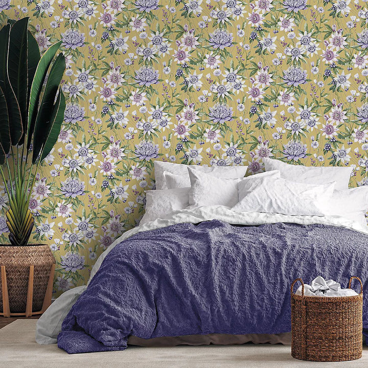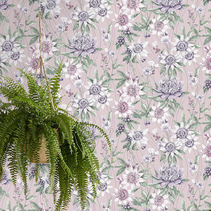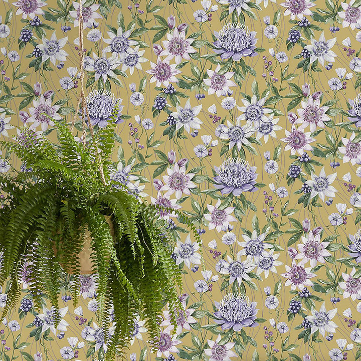 Bring the lush, botanical beauty of the tropics into any room with the Amazonia Passiflora Wallpaper. This design features a flowing floral trail of passionflowers, proteas, buds and berries in soft, painterly tones, all set against different backgrounds—choices including ochre, pink, or metallic silver—that dramatically shift the mood from warm and earthy to bright and shimmering. The art-inspired detailing and curved foliage lend a whimsical elegance, turning walls into living canvases.