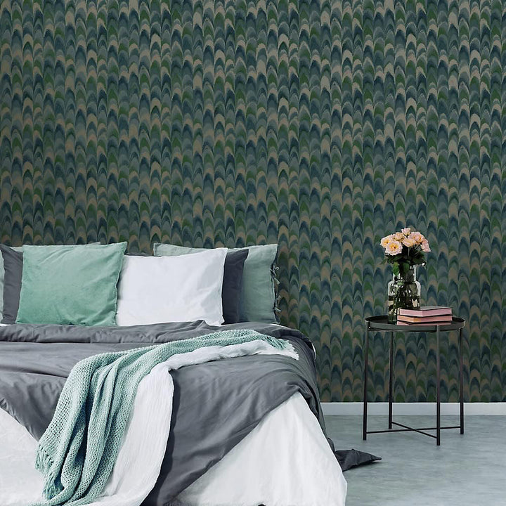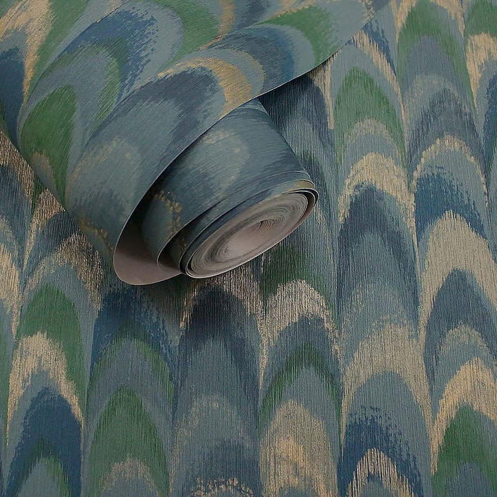 Elevate your interior with the lush, shimmering style of the Ruba Geometric Teal Metallic Wallpaper. Inspired by cascading peacock feathers, this design flows in vertical hues of teal and green, enriched by subtle metallic shimmers that catch the light at just the right angle. Its texture and depth make it an ideal choice for creating a feature wall that feels both luxurious and inspiring, while still being versatile enough to anchor an entire room. With its durable vinyl face, non-woven backing, and paste-the-wall application, it delivers designer impact without high fuss. Ruba is more than decoration—it’s drama, movement, and elegance wrapped into one beautifully finished wallcovering.