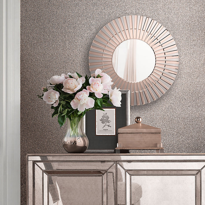 With a shimmering bronze-metallic finish and luxe texture, this wallpaper makes a bold feature wall that catches light and demands attention. A rich, glowing bronze hue combines with glittery accents and textured embossing to deliver a look both opulent and modern.