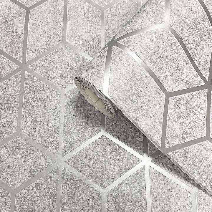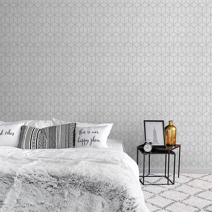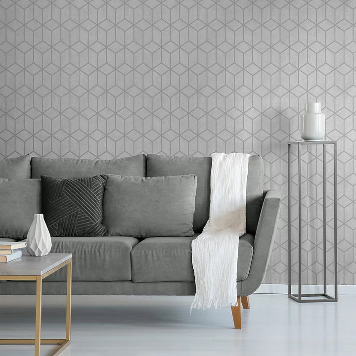 Elevate your interior with Muriva Axton Cube Grey Metallic Wallpaper, a sleek fusion of industrial edge and geometric elegance. Its cube-print motif—sharp, faceted, and modern—is layered over a textured grey vinyl ground enriched with metallic inks and touches of glitter. This combination gives walls a reflective shimmer that changes with the light and adds a luxe, contemporary feel without overpowering your décor.