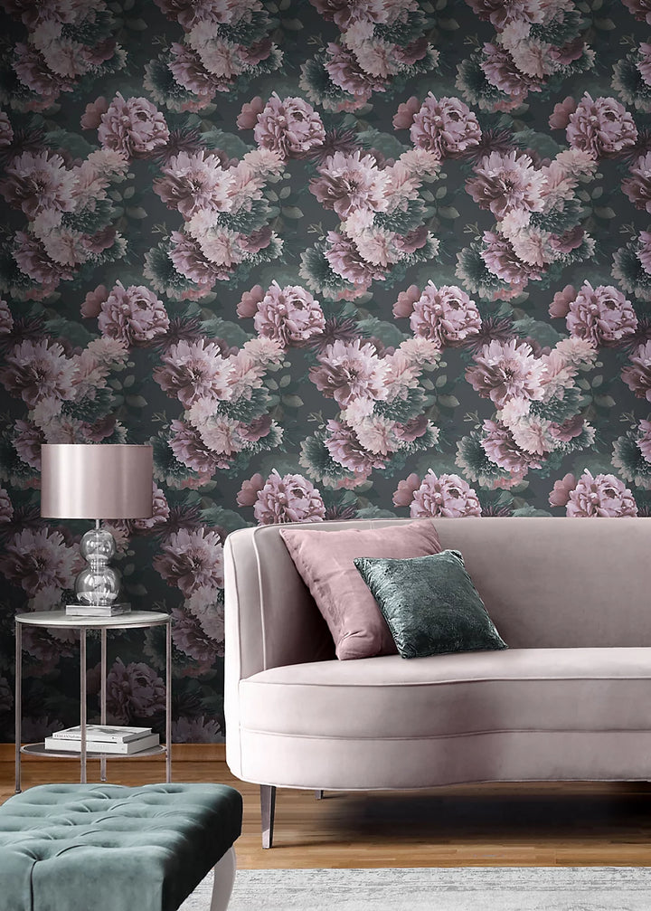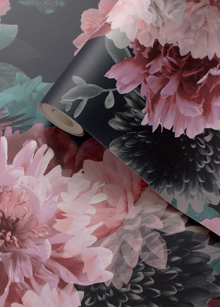 Crafted with a smooth paper surface, this wallpaper is perfect for creating a dramatic feature wall or beautifying an entire room. The floral design draws inspiration from high-end fashion florals, bringing a refined touch to lounges, bedrooms, or dining rooms. Washable finish and straight-match repeat make it both beautiful and practical.