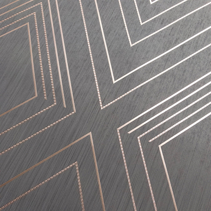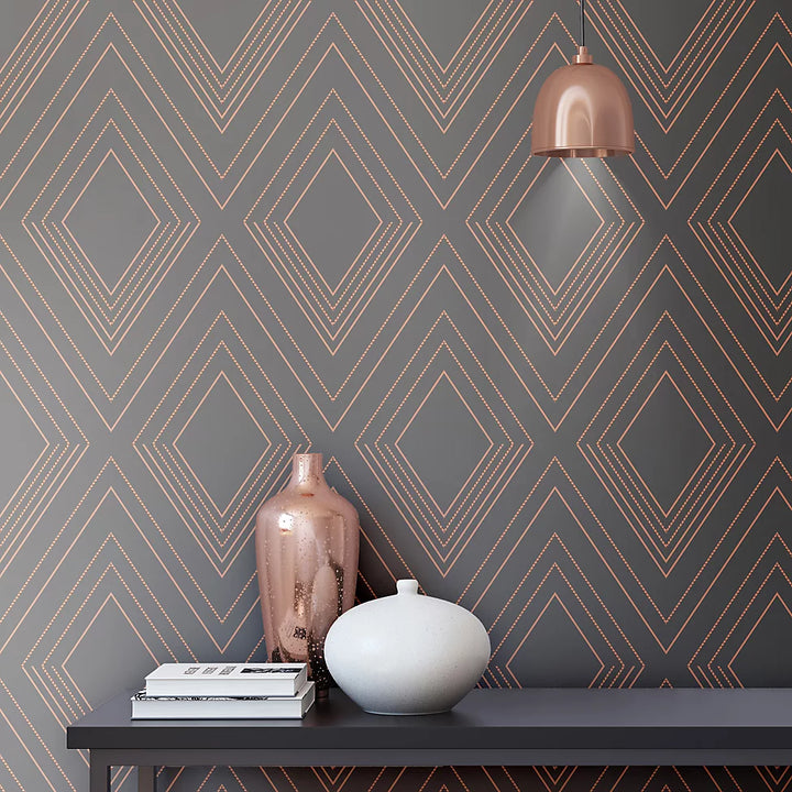 Transform your room with the sleek, modern glamour of Muriva Metallic Charcoal & Rose Gold Geometric Wallpaper. Bold geometric diamonds, accented with polished rose-gold foil and textured dots, create an eye-catching pattern that reflects light and adds depth. Set against a soft charcoal backdrop with a subtle, elegant vertical texture, this wallpaper strikes the perfect balance between luxe shine and sophisticated restraint.