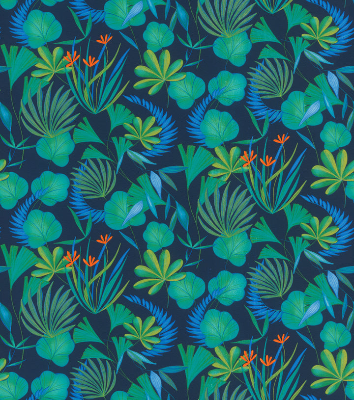 Finish / Colour Tones | Navy background with green leaf motif on vinyl texture |