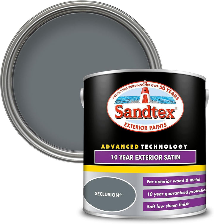 Give your exterior surfaces a fresh, refined look with the Sandtex 10 Year Exterior Satin Paint in the shade Seclusion. This rich, mid-to-dark grey satin finish brings a modern, architectural feel to doors, window frames, garden furniture, metalwork and woodwork. The durable formula is commercially engineered to withstand weathering, offer long-term protection, and deliver a smooth, low-sheen finish that elevates your exterior aesthetic.