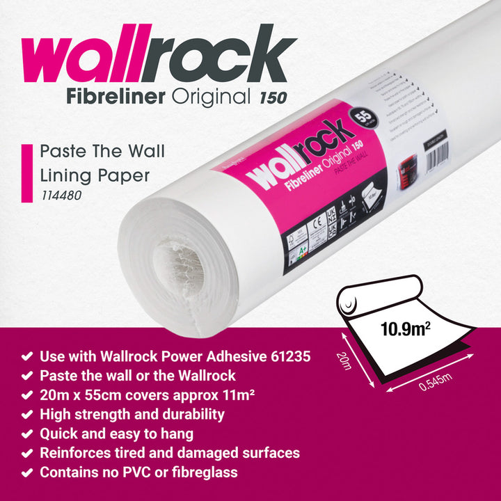 The Wallrock Fibreliner Smooth 55 Double is a premium lining paper designed to deliver a smooth, modern finish for walls and ceilings. Measuring 20 meters in length and 55 centimeters in width, it covers approximately 11 square meters per roll.